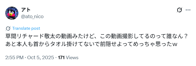 草間リチャード敬太さんの露出動画を撮影した人物については、現時点で公表も特定もされていません。