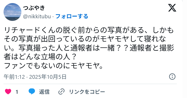 リチャードさんが下半身を露出する動画が流出していますが『これを撮ったのは誰?』と気になる方が多いようですね。