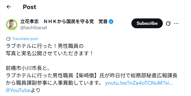 これが真実なのかどうかは不明ですが、N国党の立花さんが以上の様にX(旧ツイッター)に投稿していますね。
